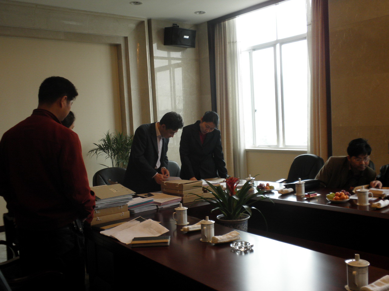 圖為市創(chuàng)建勞動(dòng)關(guān)系和諧企業(yè)考評(píng)小組成員檢查相關(guān)資料