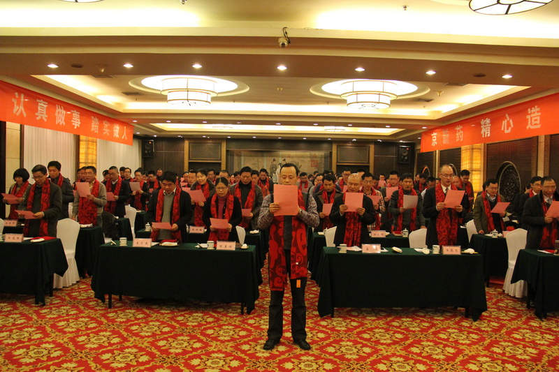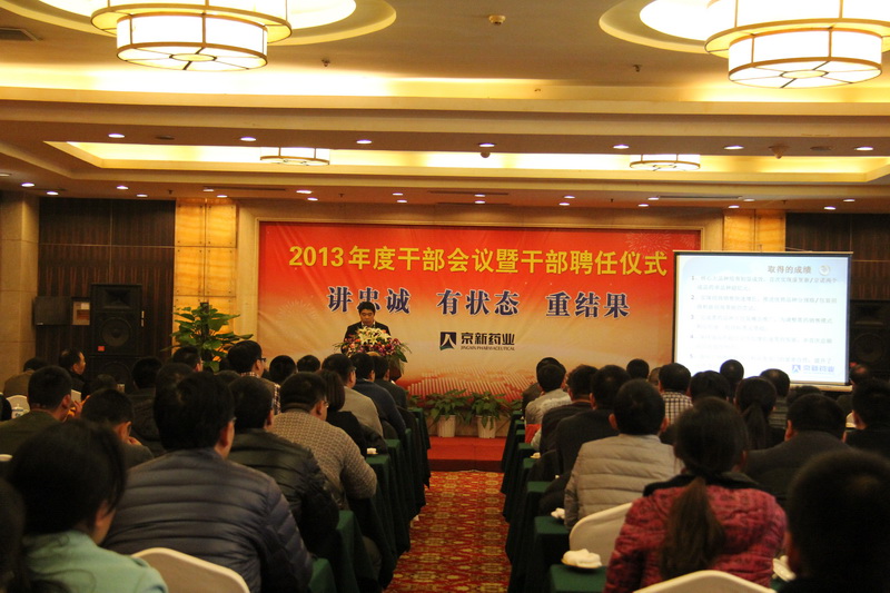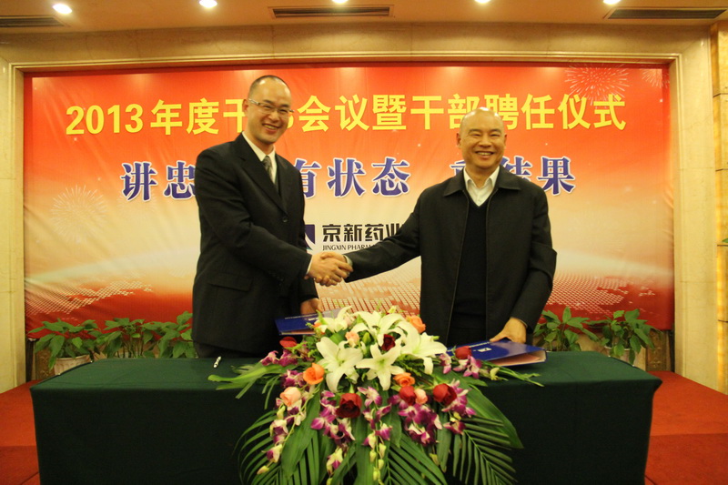 會(huì)上,各分子公司總經(jīng)理和研究院院長(zhǎng)先后進(jìn)行2013年度工作述職、2014年工作思路和計(jì)劃匯報(bào)。董事長(zhǎng)呂鋼在會(huì)上作《總結(jié)2013、展望2014》工作報(bào)告。總經(jīng)理王能能代表公司發(fā)布“京新藥業(yè)2013年度十件大事”并部署2014年度重點(diǎn)工作。會(huì)議安排了年度目標(biāo)責(zé)任書簽訂儀式,董事長(zhǎng)與總經(jīng)理王能能、總經(jīng)理王能能與各分子公司總經(jīng)理、研究院院長(zhǎng)分別簽訂了2014年度目標(biāo)責(zé)任書。隨后,會(huì)議舉行了隆重而又莊嚴(yán)的干部聘任宣誓儀式,董事長(zhǎng)呂鋼為每一名干部頒發(fā)聘任書,并為每名干部、專家、核心員工佩戴祈福紅圍巾。最后,會(huì)議在全體參會(huì)干部的集體就職宣誓中圓滿結(jié)束。