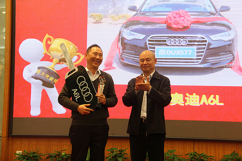 會議最后隆重表彰了“2014年度董事長優秀進步獎”和“2014年度董事長重大突破獎”,廣豐京新總經理楊超鋒榮獲“2014年度董事長優秀進步獎”,公司副總經理、原料藥銷售公司總經理胡天慶和上虞京新總經理朱志斌榮獲“2014年度董事長重大突破獎”,呂董親自為他們頒發了獎杯和獎品。