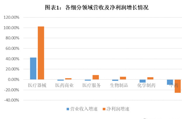二、細(xì)分板塊:醫(yī)療器械一枝獨(dú)秀,中藥滑坡最大
