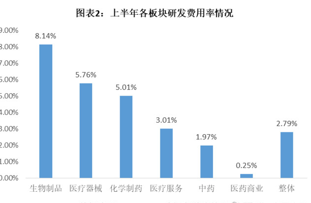 此外,中藥板塊研發(fā)投入力度偏低,也是削弱其長期競爭力,從而間接導(dǎo)致業(yè)績下滑的原因之一。如圖表2所示,上半年中藥板塊的研發(fā)費(fèi)用占營業(yè)收入的比重僅為1.97%,僅高于醫(yī)藥商業(yè)板塊,遠(yuǎn)低于生物制品(8.14%)和化學(xué)制藥板塊(5.01%)。