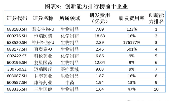 1. 創(chuàng)新榜:君實(shí)生物奪冠,生物制品領(lǐng)域研發(fā)投入普遍較高